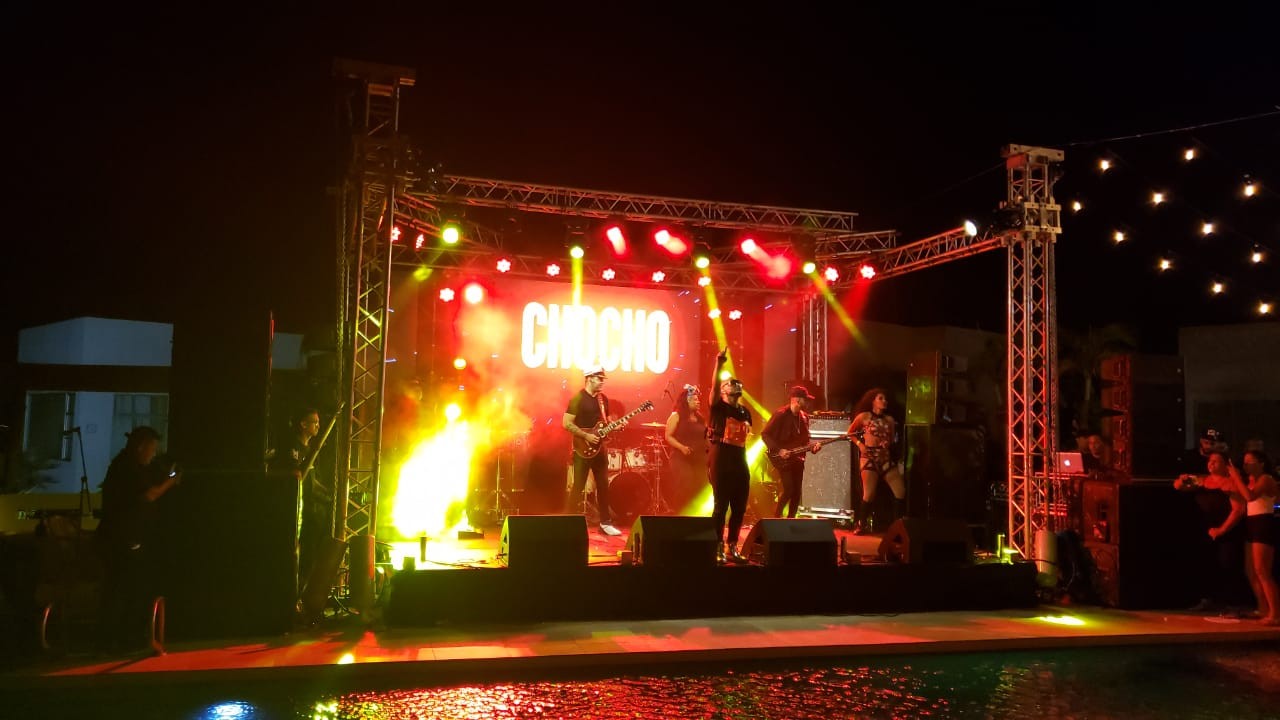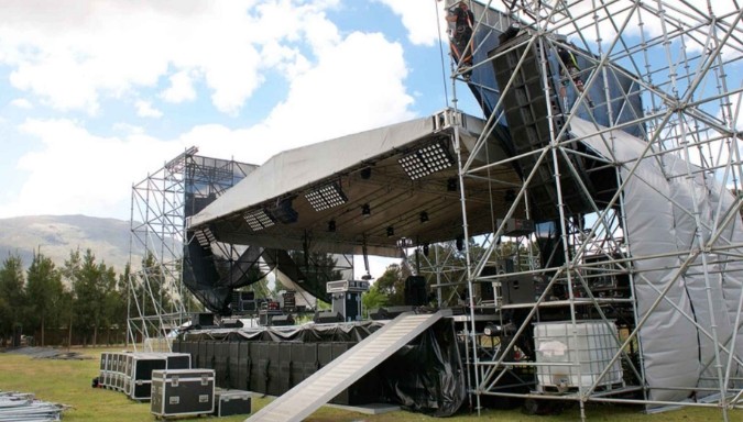 VerConsta de 2 tramos de truss uno en cada esquina de la tarima, en los cuales van a ir 2 cabezas móviles 550, 8 par led 64 de 3 vatios y una máquina de humo.